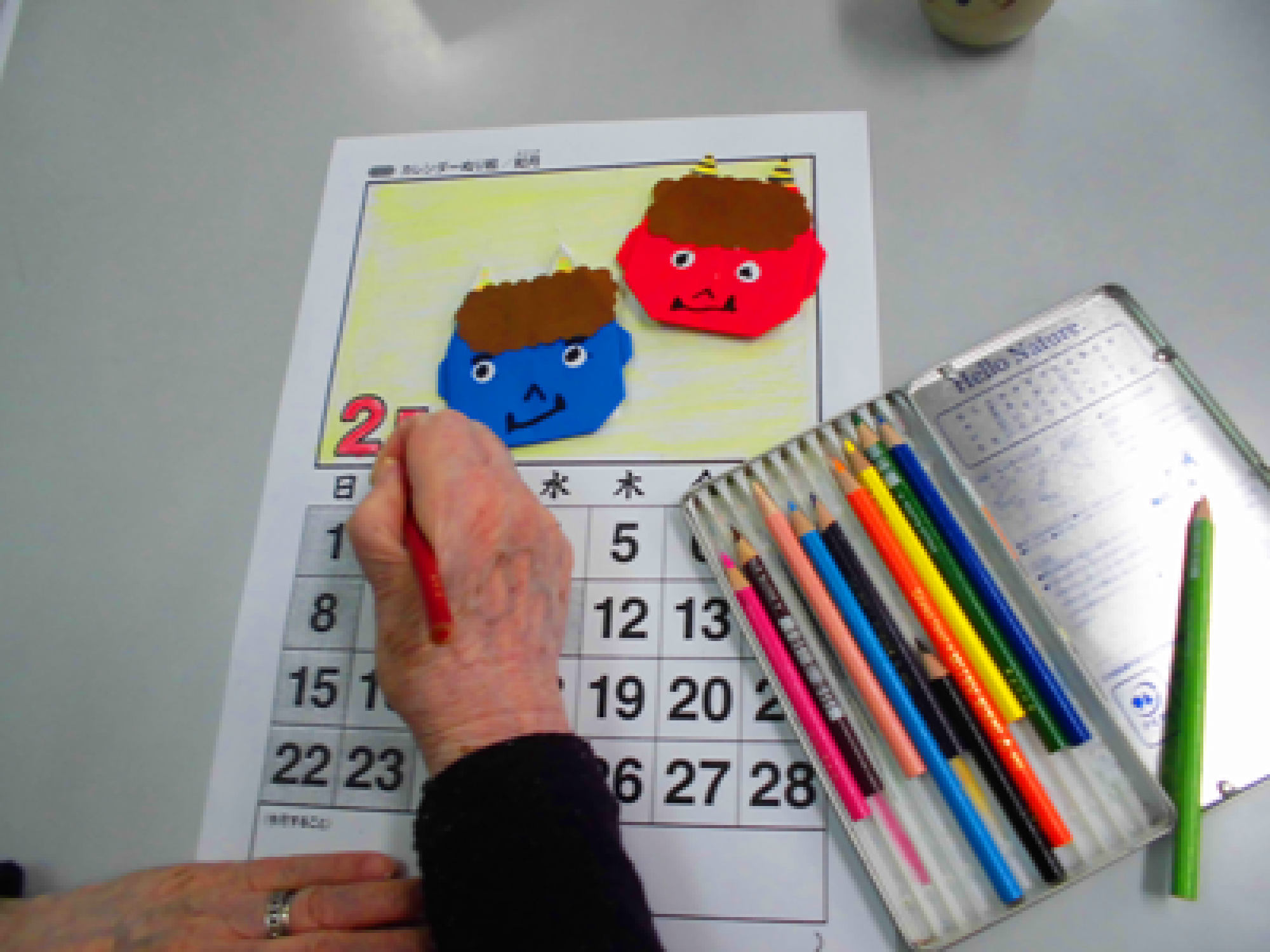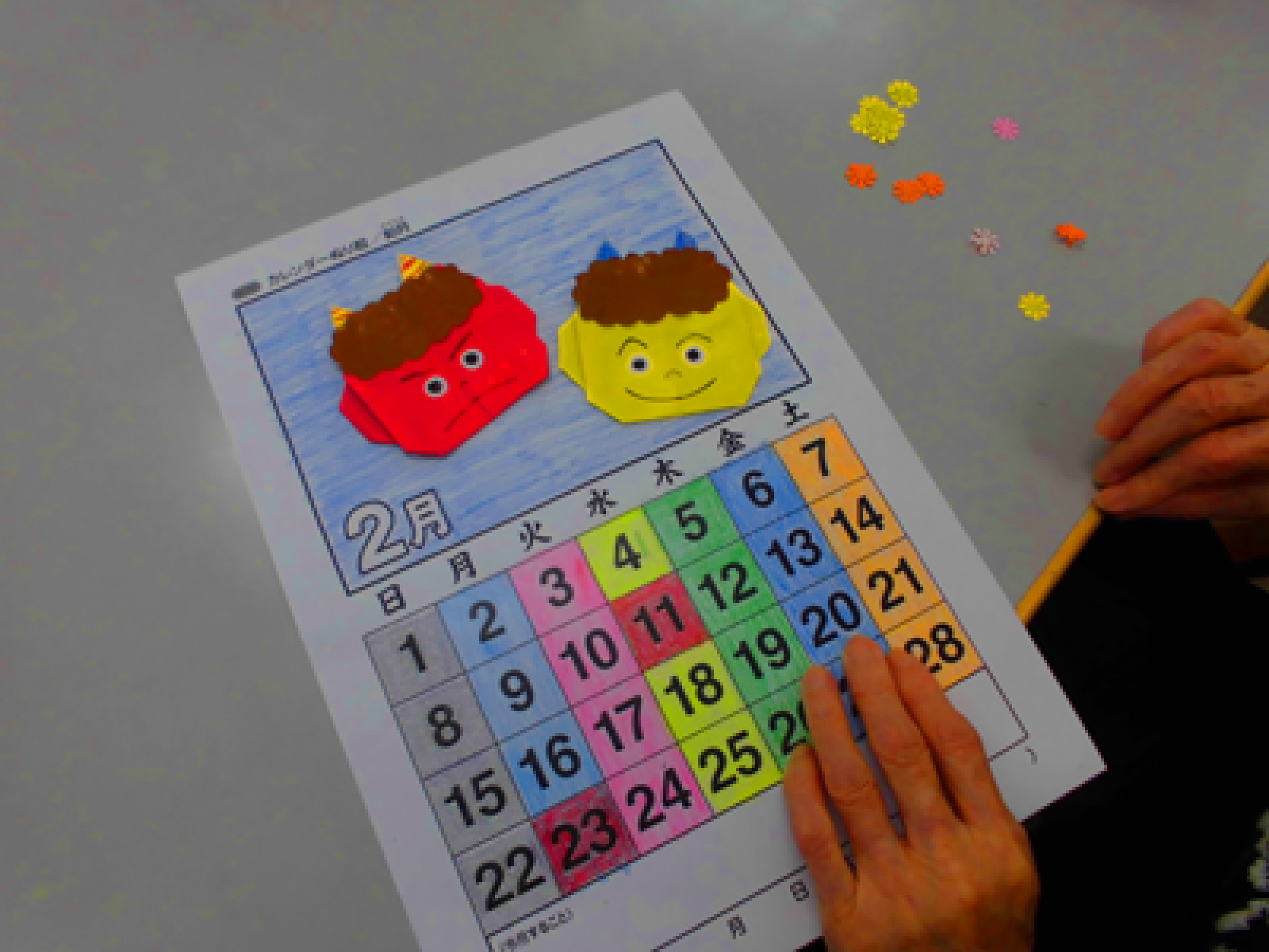 カレンダー作り 一年間健康で過ごせますようにと願いを込めて節分カレンダーを作成しました。
